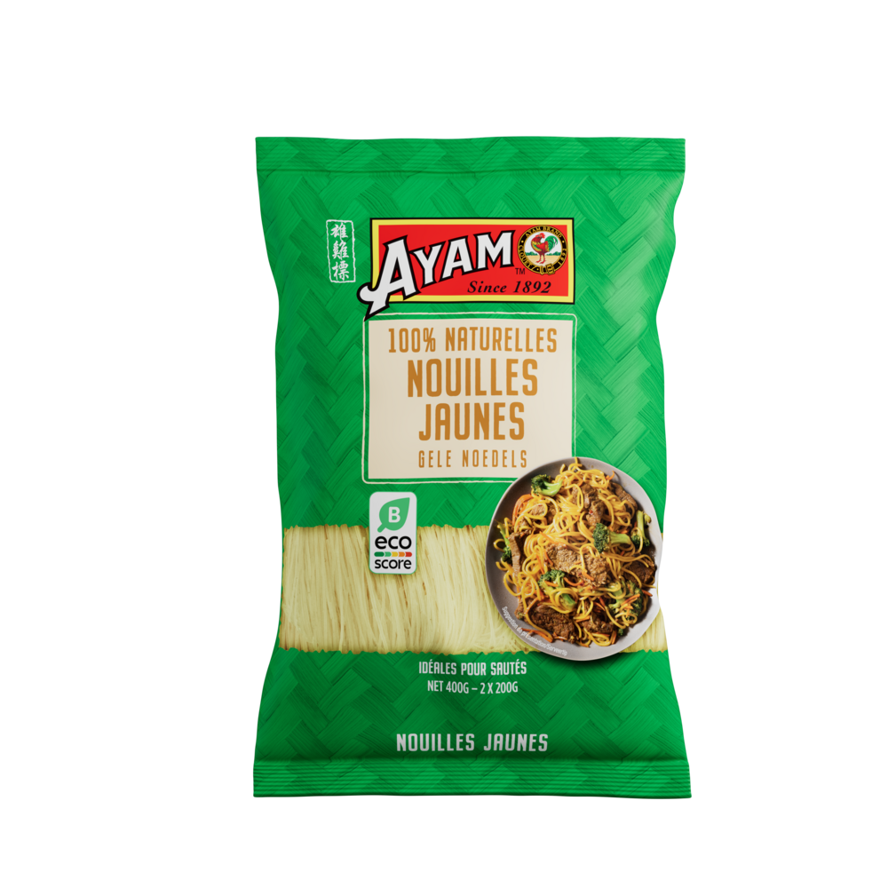 Haute Qualité - 100% NaturellesAYAM s'efforce de proposer des produits aux listes d'ingrédients courtes. Nous avons banni les aliments génétiquement modifiés, les conservateurs, le glutamate de sodium, les gras trans et les graisses hydrogénées de tous nos produits. Nos nouilles chinoises jaunes AYAM sont composées à 100% d'ingrédients naturels. Recommendation de préparationPlonger les nouilles 3 minutes dans de l'eau bouillante, jusqu'à ce qu'elles soient molles. Égoutter. |
