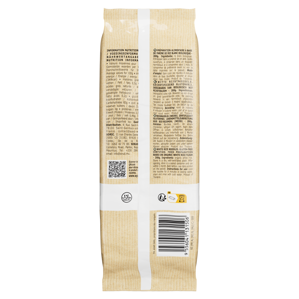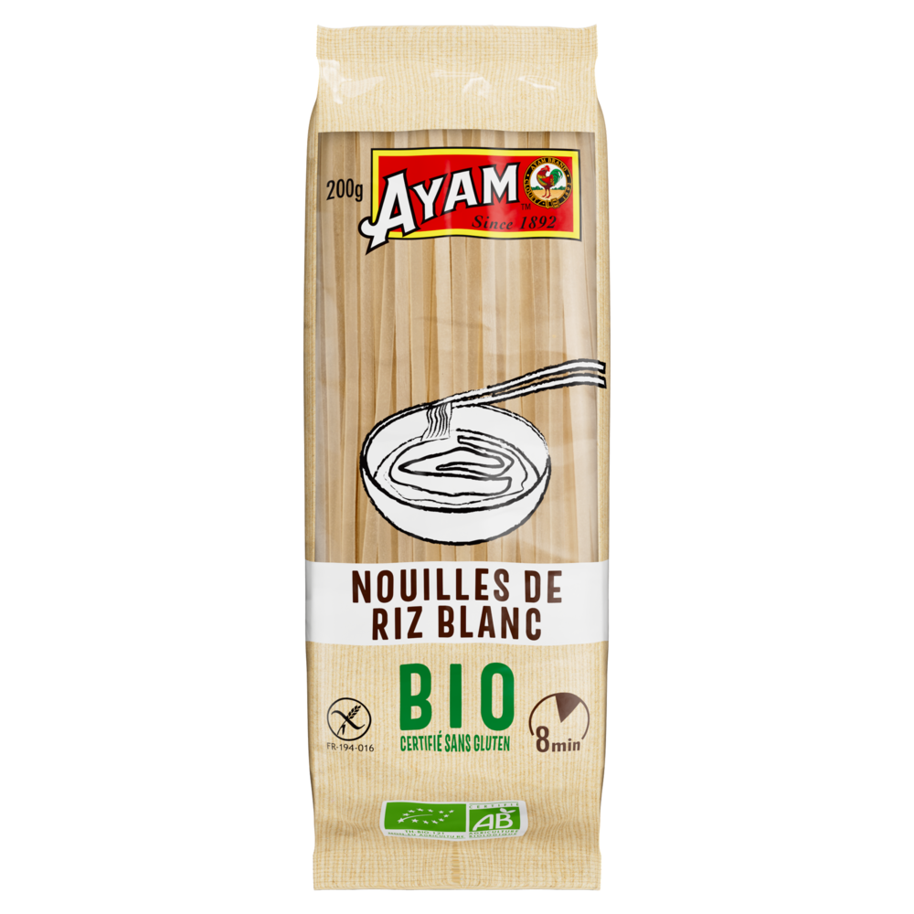 Certifiées BioLes nouilles de riz Blanc AYAM™ sont certifiées Bio par ECOCERT, Cert. TH-BIO-121. NATURELLEMENT Sans GlutenLes nouilles de riz Blanc AYAM™ sont naturellement sans gluten. Haute QualitéAYAM s'efforce de proposer des produits aux listes d'ingrédients courtes. Nous avons banni les aliments génétiquement modifiés, les conservateurs, le glutamate de sodium, les gras trans et les graisses hydrogénées de tous nos produits. Recommendation de préparationPlonger les nouilles 8 minutes dans de l'eau bouillante ou 30 minutes dans de l'eau tiède, jusqu'à ce qu'elles soient molles. Égoutter. |