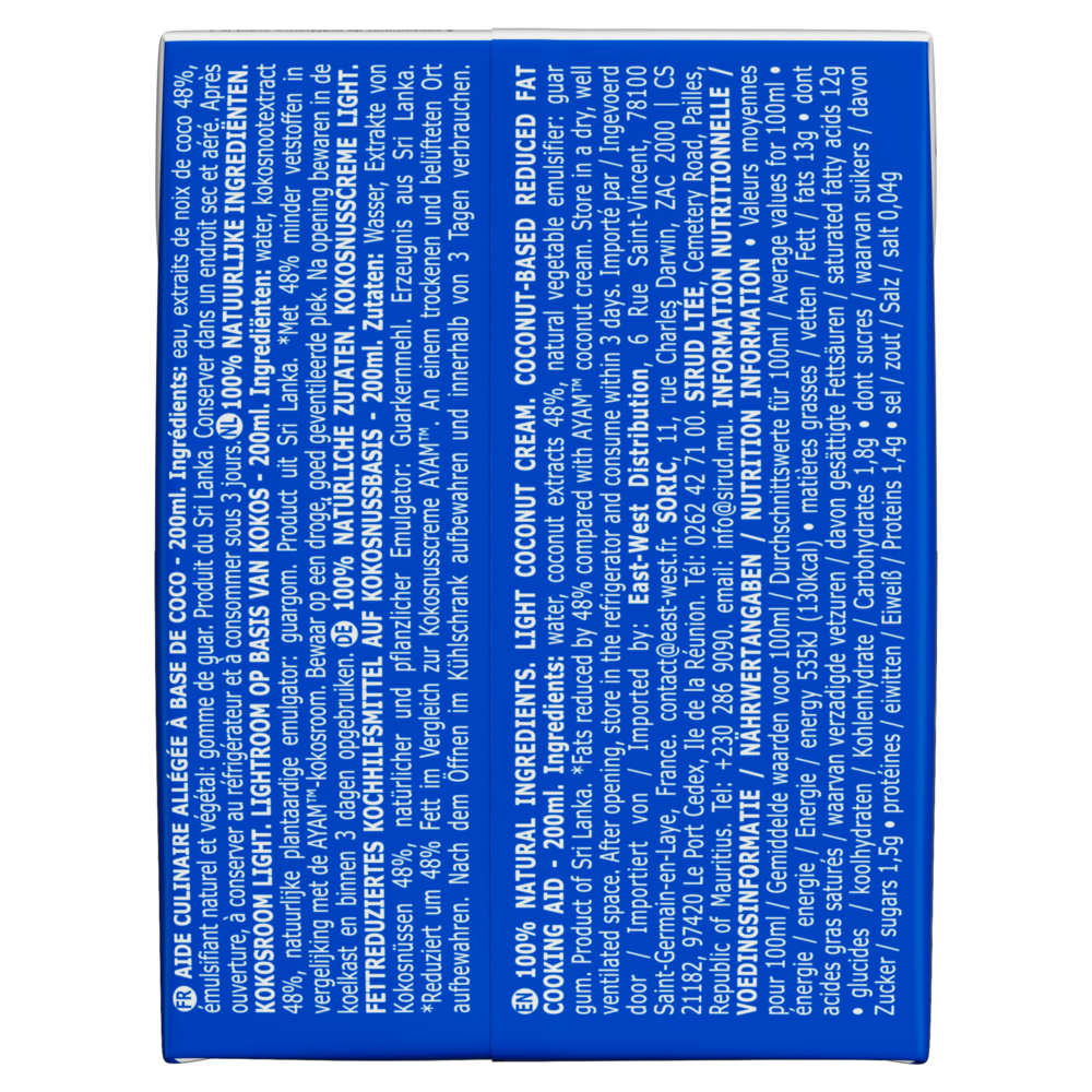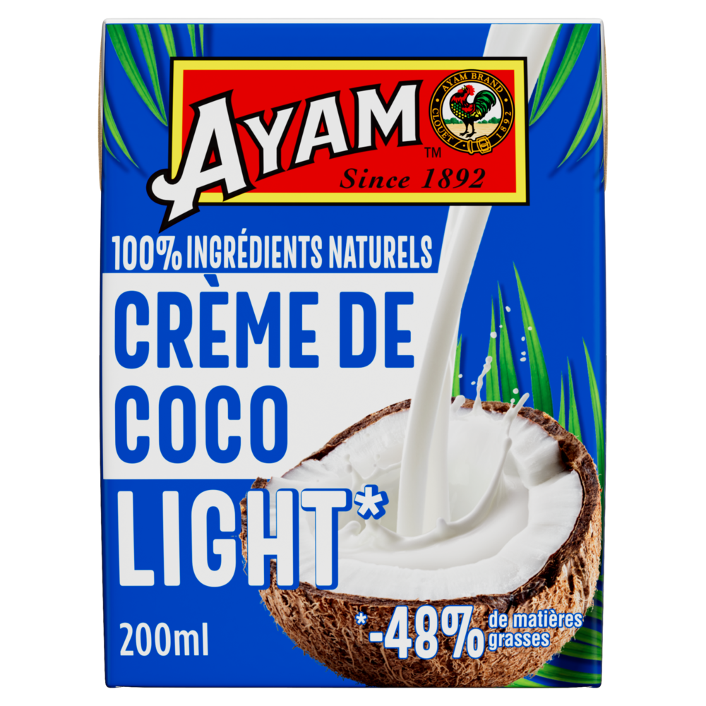 100% ingrédients naturelsCette crème de coco allégée AYAM™ en tétrapak est composée à 100% d'ingrédients naturels. Nous utilisons uniquement de la gomme de guar, naturelle et végétale, l'émulsifiant de référence des produits Bio. Haute QualitéLa technologie Ultra-Haute Température (UHT) utilisée par AYAM™, assure un produit frais avec une longue durée de vie sans besoin de conservateurs. Naturellement Sans LactoseLes laits et crèmes de coco AYAM™ sont de parfaits substituts sans lactose pour les recettes avec du lait ou de la crème fraiche. Développement DurableDans une logique environnementale, AYAM™ estime que l'intégralité du produit doit être utilisé dans le processus de production afin de limiter nos déchets. Par exemple, notre usine de produits à base de noix de coco utilise les coques pour faire fonctionner ses brûleurs, ce qui permet de ne pas consommer d'énergie fossile. Les déchets restant sont tous recyclés. L'intégralité des noix de coco est ainsi utilisée. |