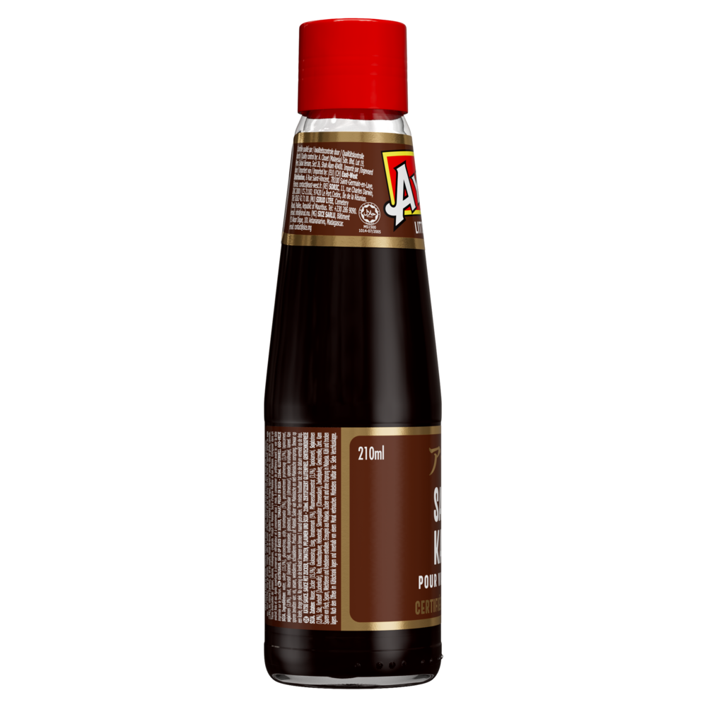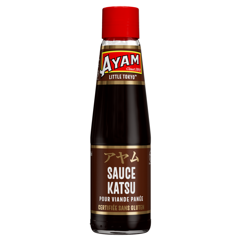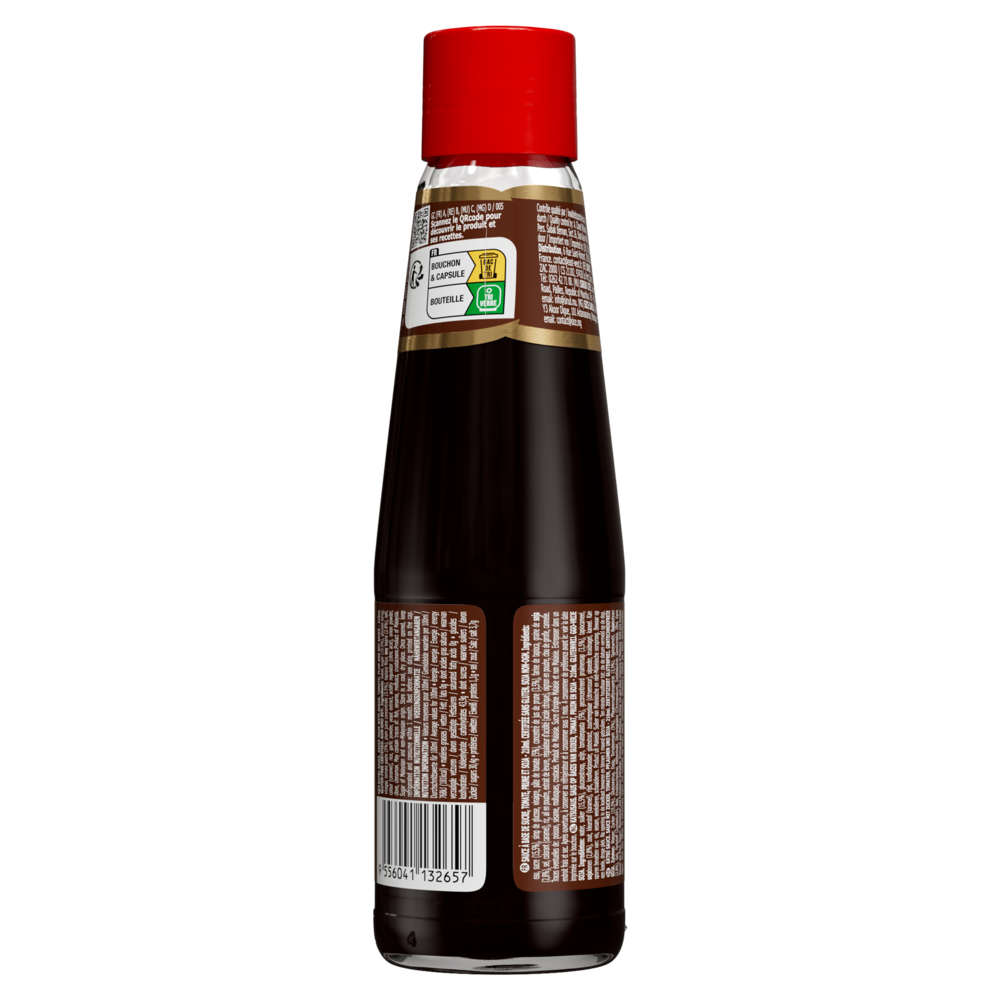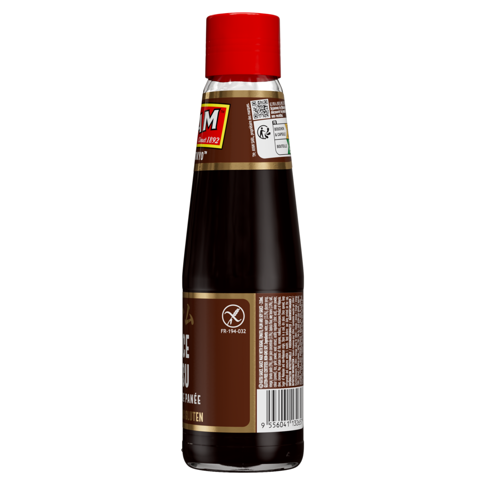 Eau, sucre (15,5%), sirop de glucose, vinaigre, pâte de tomate (5%), concentré de jus de prune (3,5%), farine de tapioca, graine de soja (2,8%), sel, colorant (caramel), riz, ail en poudre, extrait de levure, régulateur d'acidité (acide citrique), oignon en poudre, clou de girofle, cannelle.