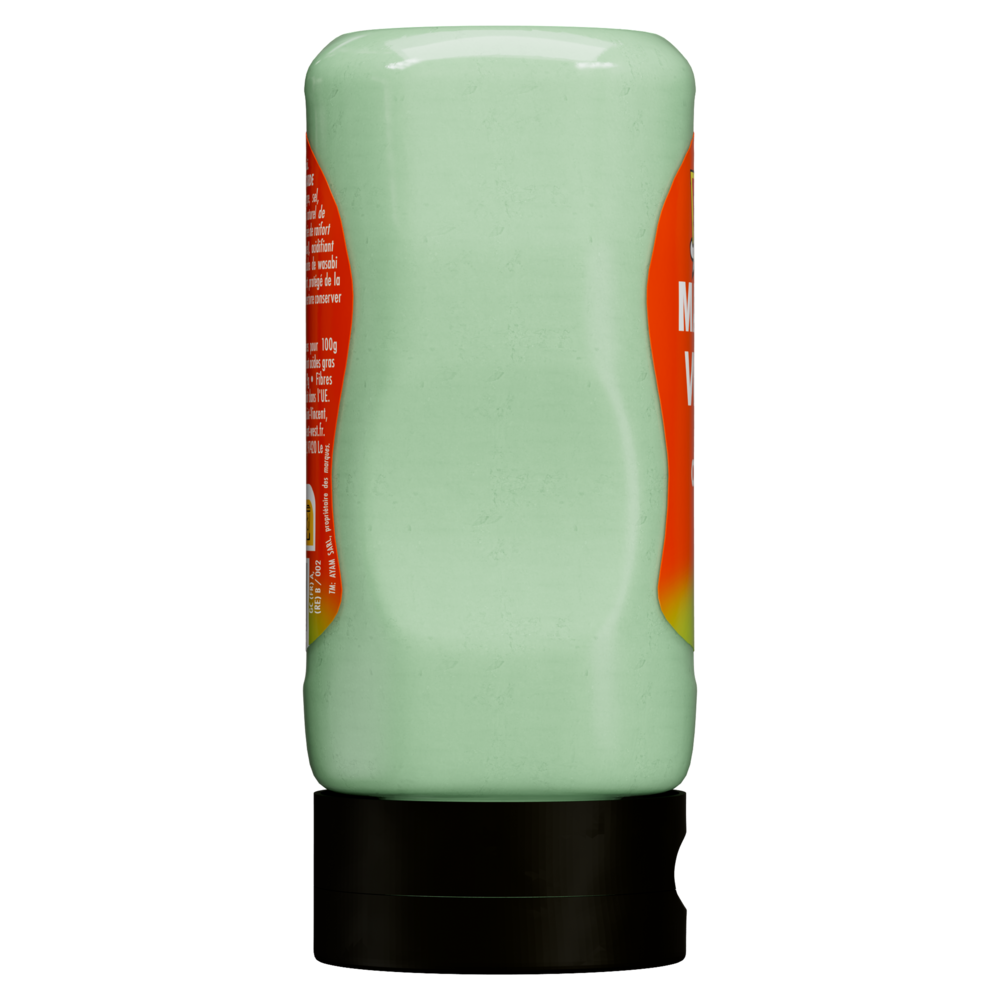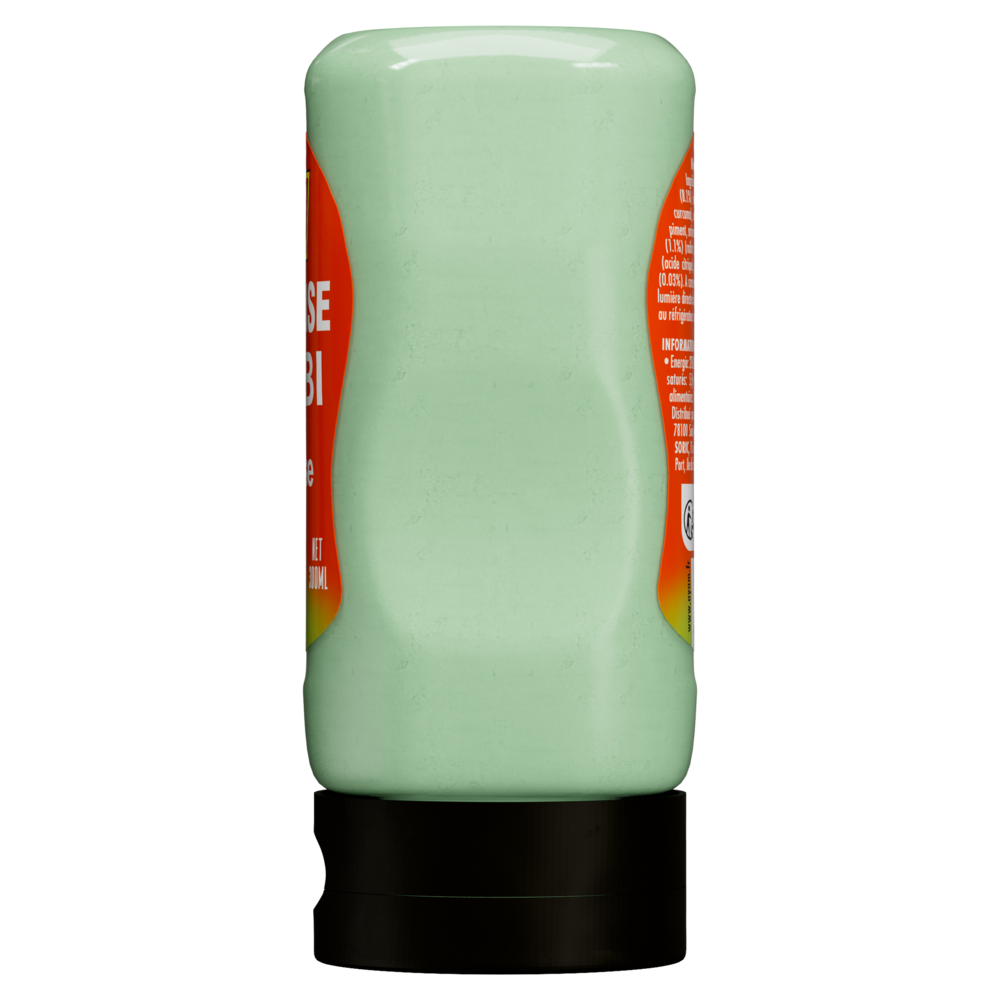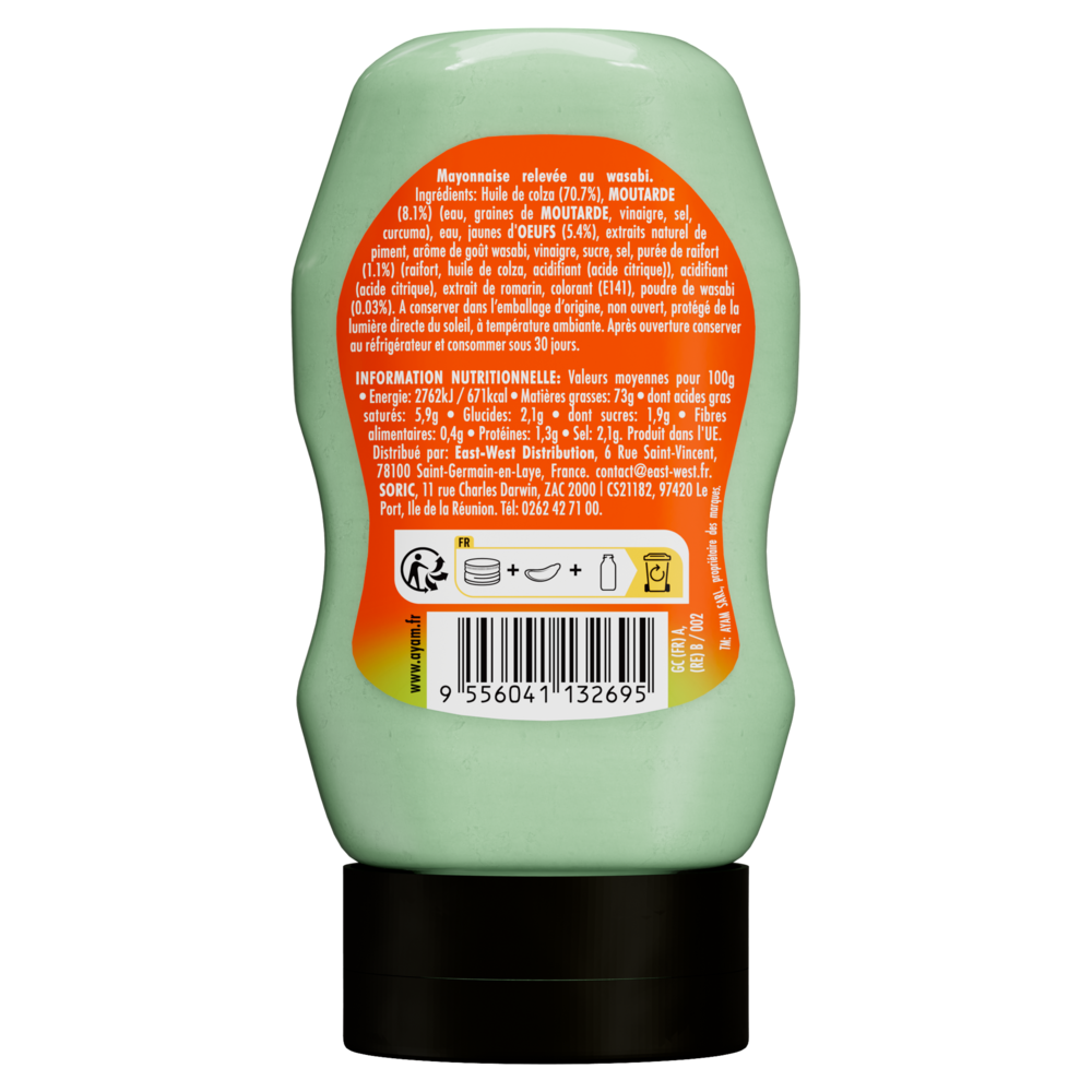 Huile de colza (70,7%), MOUTARDE (eau, graines de MOUTARDE, vinaigre,sel, épices) (8,1%), eau (7,1%), jaunes d'OEUFS (5,4%), extraits naturel de piment, arôme de goût wasabi, vinaigre (2,4%), sucre, sel(1,5%), purée de raifort (raifort, huile de colza, acide citrique, métabiSULFITE de sodium), acidifiant (acide citrique), extrait de romarin, colorant (complexes de cuivre de chlorophilines), poudre de wasabi (0,03%).