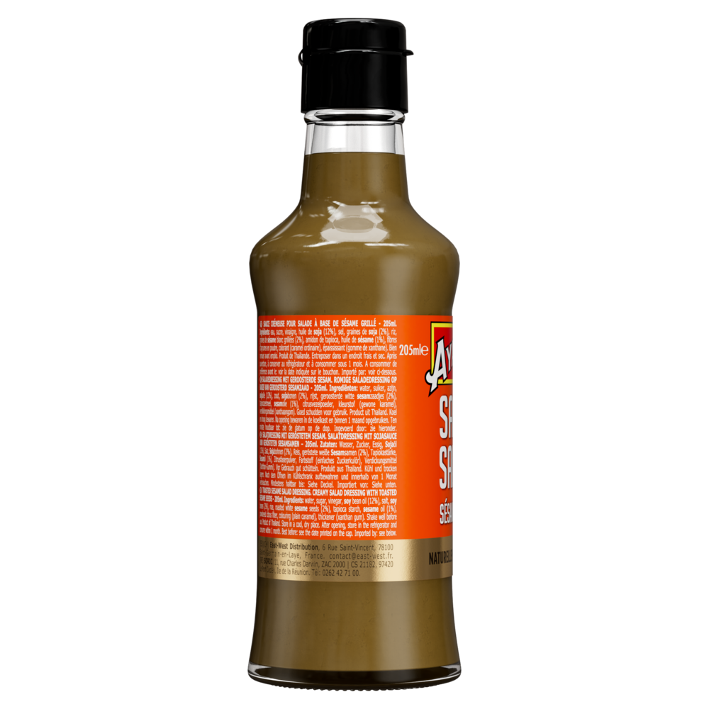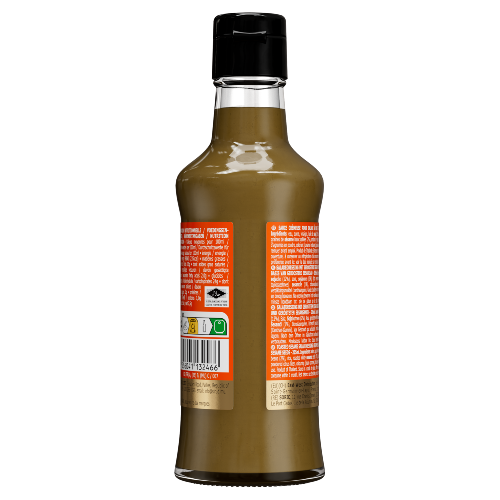Eau, sucre, vinaigre, huile de soja (12%), sel, graines de soja (2%), riz, graines de sésame blanc grillées (2%), amidon de tapioca, huile de sésame (1%), fibres d'agrumes en poudre, colorant (caramel ordinaire), épaississant (gomme de xanthane).