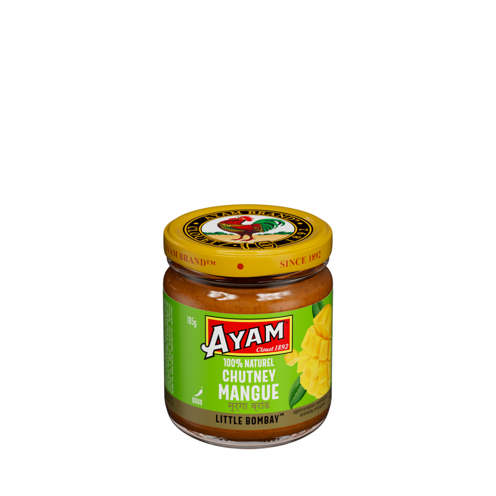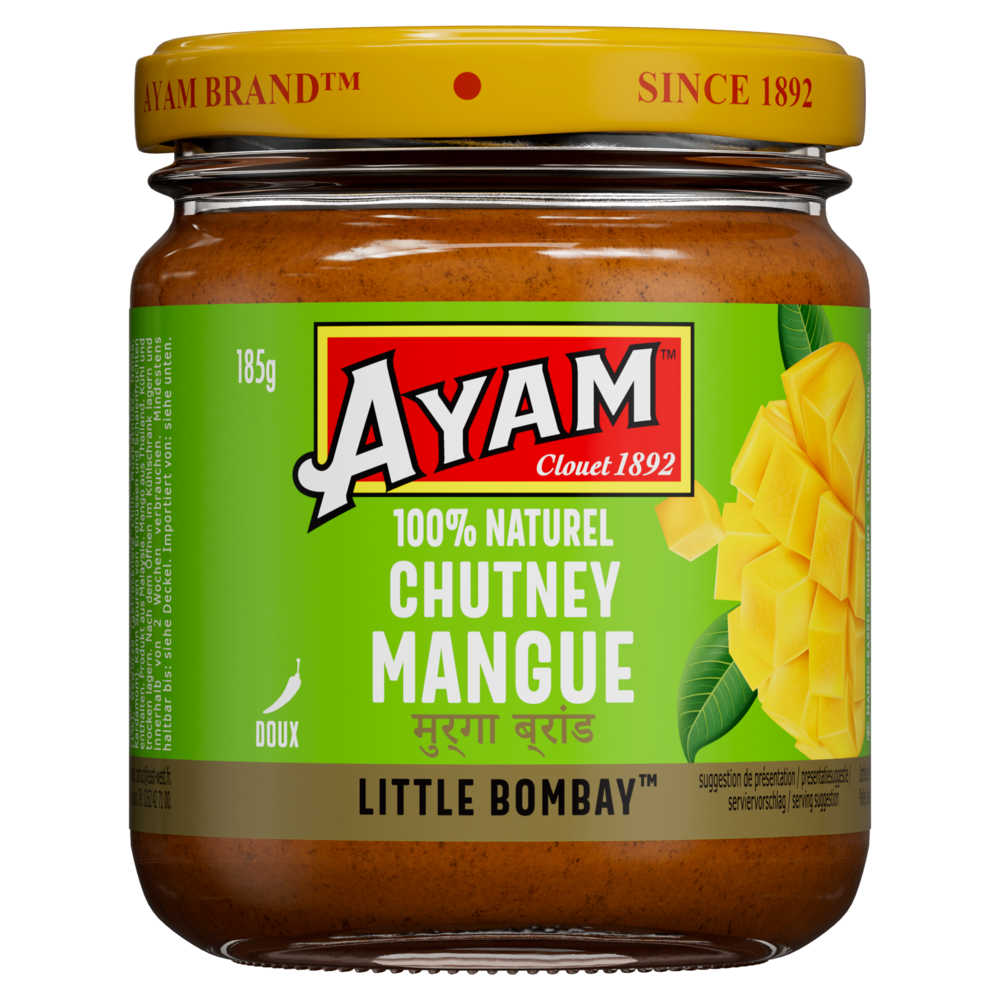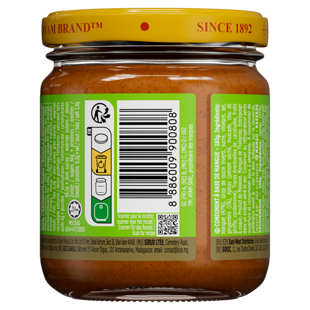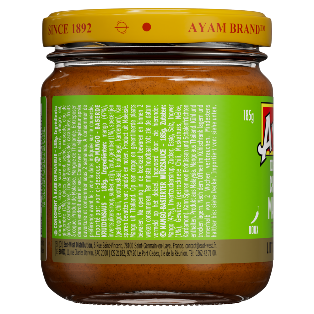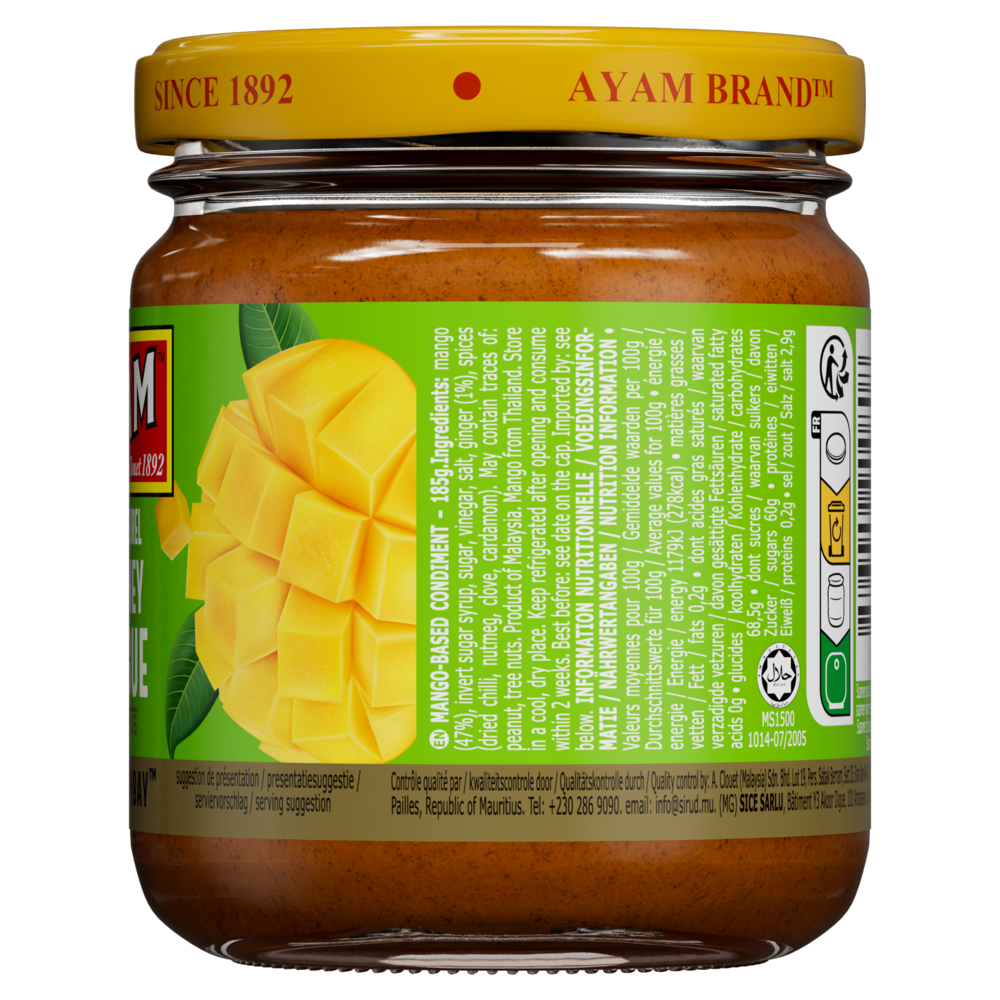 Mangue, sirop de sucre inverti, sucre, vinaigre, sel, gingembre, épices (piment séché, muscade, clou de girofle, cardamome).