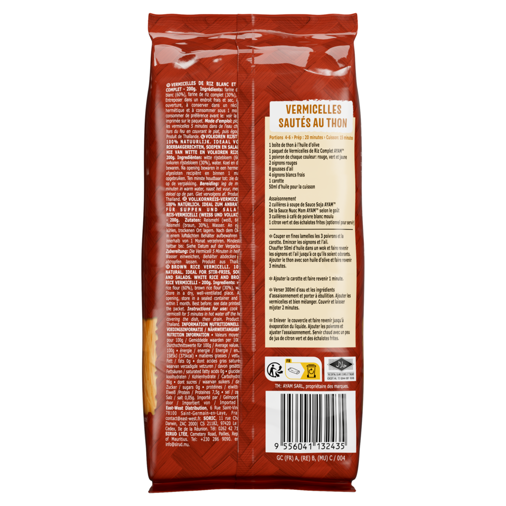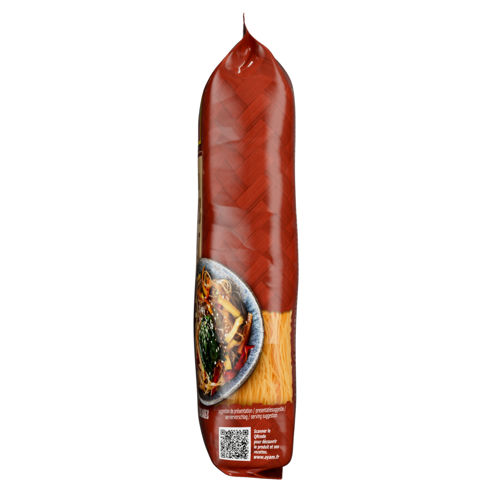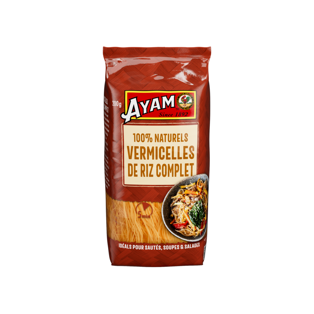 NATURELLEMENT Sans GlutenLes vermicelles de riz complet AYAM™ sont naturellement sans gluten. Haute Qualité - 100% NaturelsAYAM s'efforce de proposer des produits aux listes d'ingrédients courtes. Nous avons banni les aliments génétiquement modifiés, les conservateurs, le glutamate de sodium, les gras trans et les graisses hydrogénées de tous nos produits. Recommendation de préparationPlonger les vermicelles 5 minutes dans de l'eau bouillante. Égoutter. |