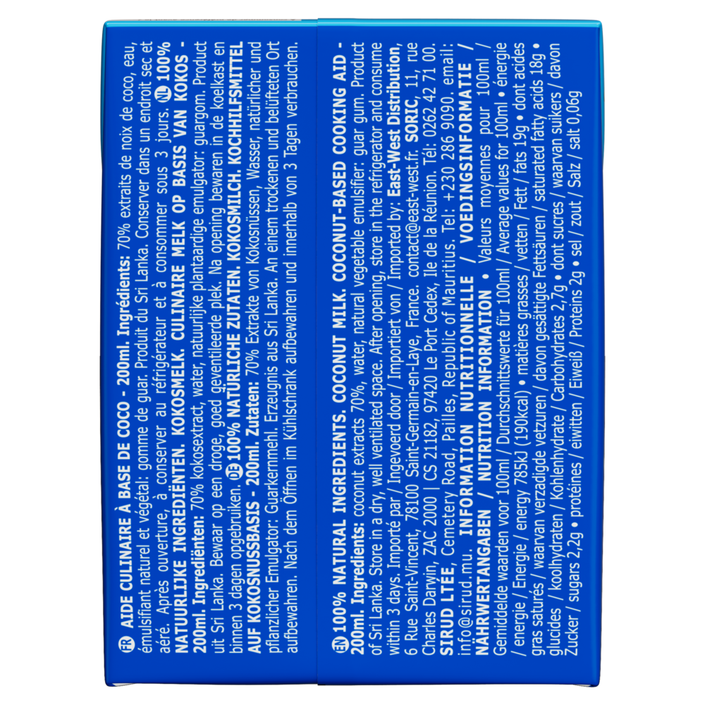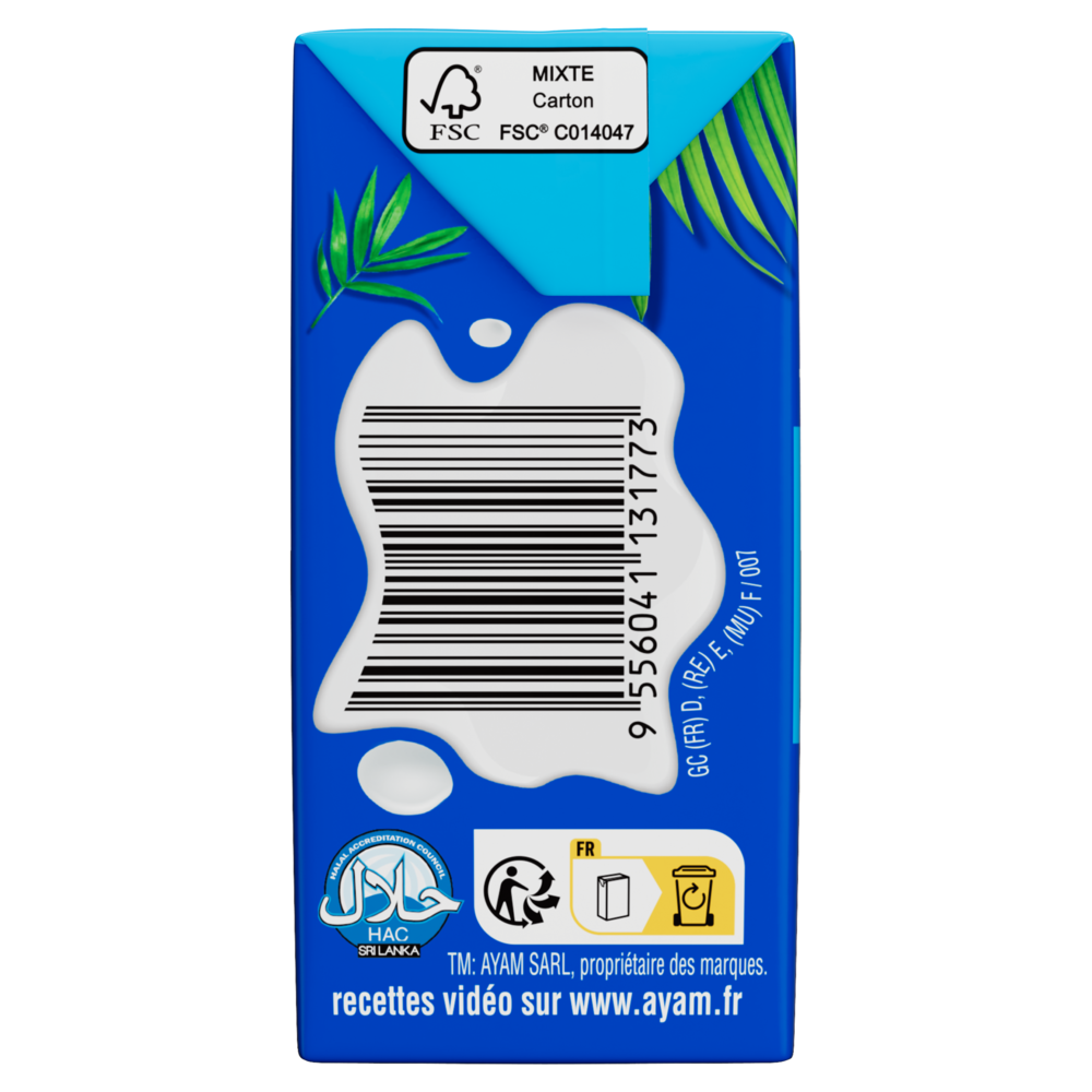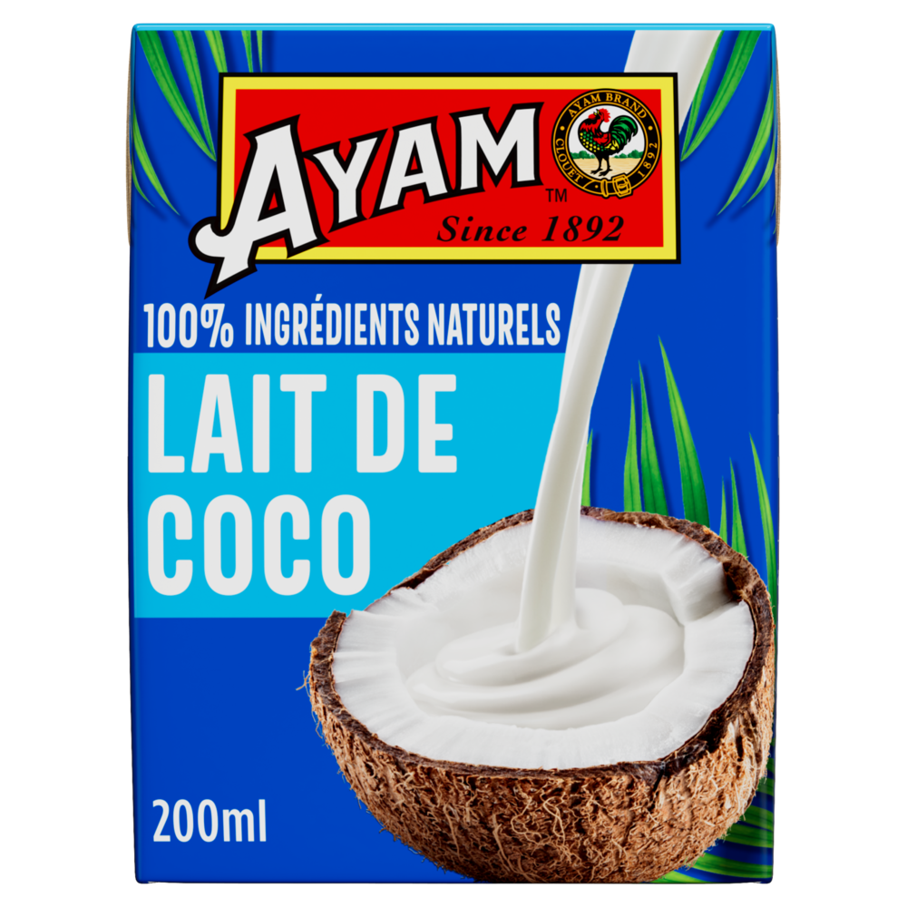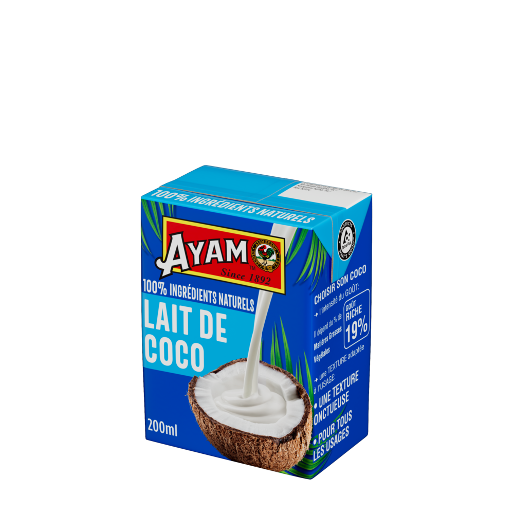 100% ingrédients naturelsCe lait de coco AYAM™ en tétrapak est composé à 100% d'ingrédients naturels. Nous utilisons uniquement de la gomme de guar, naturelle et végétale, l'émulsifiant de référence des produits Bio. Haute QualitéLa technologie Ultra-Haute Température (UHT) utilisée par AYAM™, assure un produit frais avec une longue durée de vie sans besoin de conservateurs. Naturellement Sans LactoseLes laits et crèmes de coco AYAM™ sont de parfaits substituts sans lactose pour les recettes avec du lait ou de la crème fraiche. Développement DurableDans une logique environnementale, AYAM™ estime que l'intégralité du produit doit être utilisé dans le processus de production afin de limiter nos déchets. Par exemple, notre usine de produits à base de noix de coco utilise les coques pour faire fonctionner ses brûleurs, ce qui permet de ne pas consommer d'énergie fossile. Les déchets restant sont tous recyclés. L'intégralité des noix de coco est ainsi utilisée. |