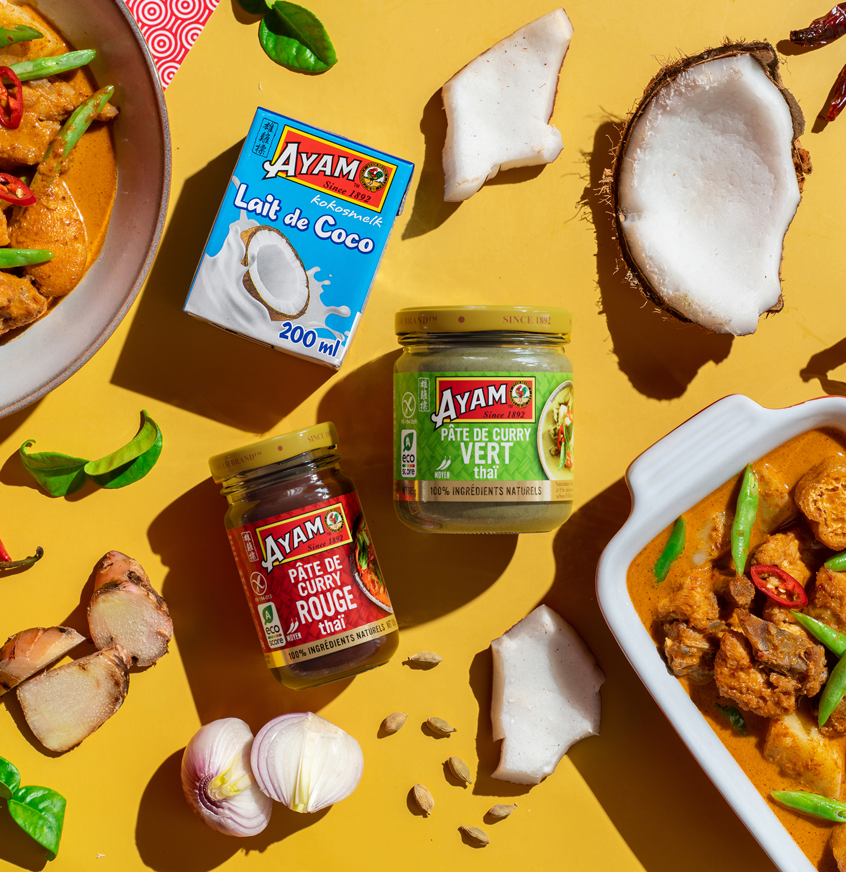 Un bol de curry asiatique dans le confort de chez vous ? C'est possible en quelques minutes avec les pâtes de curry Ayam™. Laissez vous transporter dans un voyage à travers la Thailande, l'Inde, ou encore le Japon, associant la force d'ingrédients naturels comme le piment, aux herbes et épices asiatiques. Nos pâtes de curry se glisseront dans toutes vos recettes, des plats jusqu’aux sauces, pour en relever le goût et leur apporter une belle dose de saveurs.